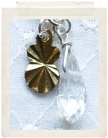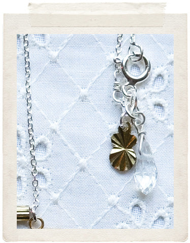 PENDANTS: Miniature: small brass medallion (glazed, sealed, crystal clear and waterproof), vintage fine diamond cut charms in shiny brass and a faceted Swarovski crystal drop on the back of the necklace, so you look adorable from all sides!