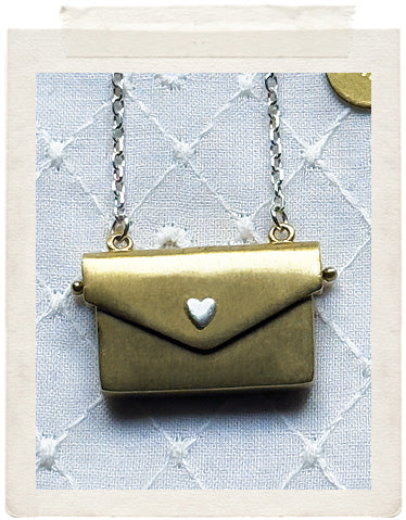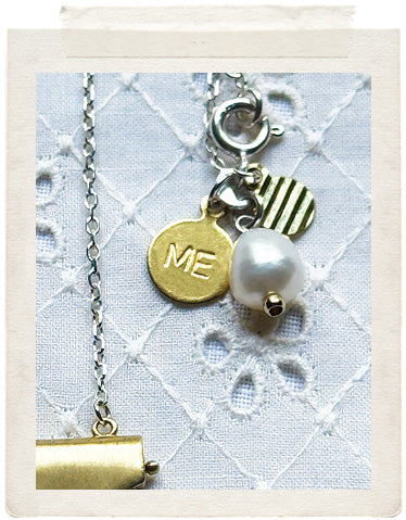 PENDANTS: small brass envelope locket with 7 different removable messages, a vintage fine diamond cut charm in shiny brass, a real fresh water pearl and a stamped ME charm on the back of the necklace, so you look adorable from all sides!