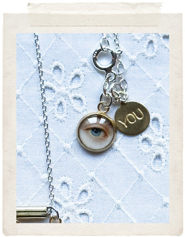 PENDANTS: Miniature: small brass medallion (glazed, sealed, crystal clear and waterproof), vintage fine diamond cut charms in shiny brass, a tiny eye and a stamped YOU charm on the back of the necklace, so you look adorable from all sides!