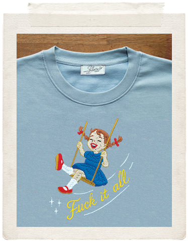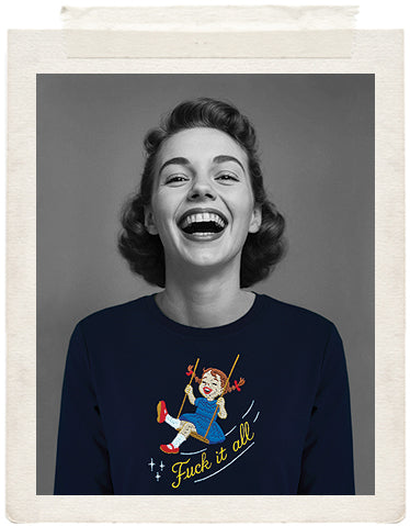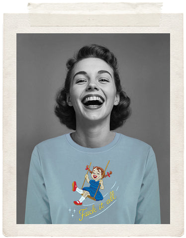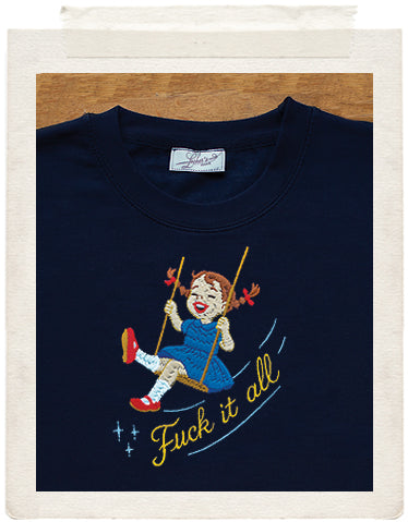 We’re just swinging through the clusterfuck we call life and honestly....I’m done worrying about everything. My new moto is: swing high, swear loud , embrace the sweet release of not giving a fuck....This sweater says what we’re all thinking: to hell with it all!