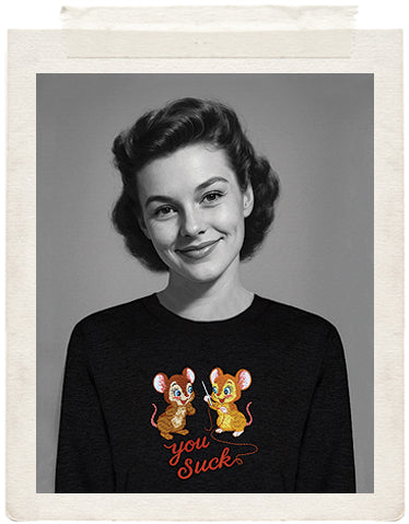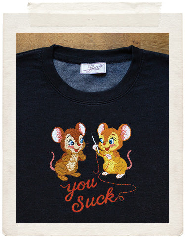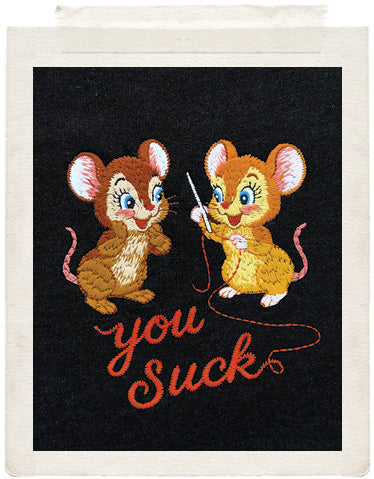 These adorable lil’ mice straight out of a Disney movie are here to stitch a friendly “you suck” right into your day. How savage! Just perfect when you wanna look cute while maintaining your status as a sarcastic menace. Just the right amount of passive-aggressive cheer.