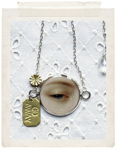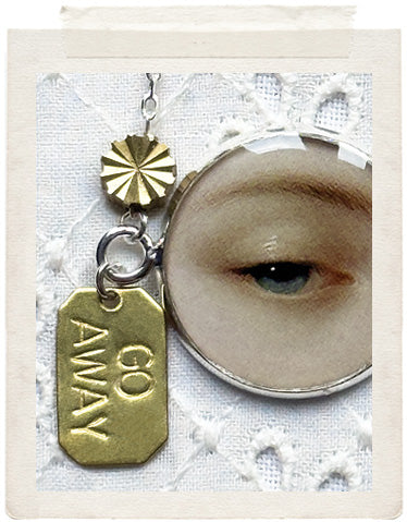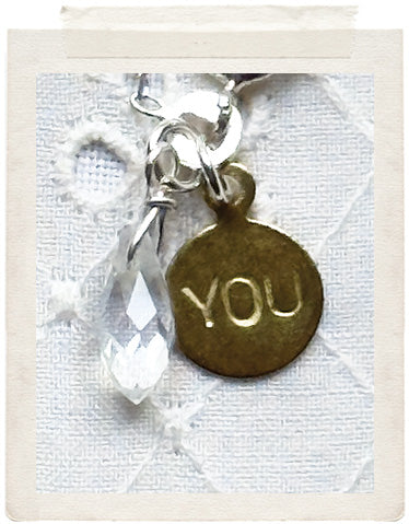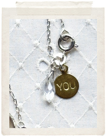PENDANTS: a sterling silver plated medallion (glazed, sealed, crystal clear and waterproof), a dainty GO AWAY brass tag, a vintage fine diamond cut charm in shiny brass, a faceted Swarovski crystal drop and a stamped YOU charm on the back of the necklace, so you look adorable from all sides!