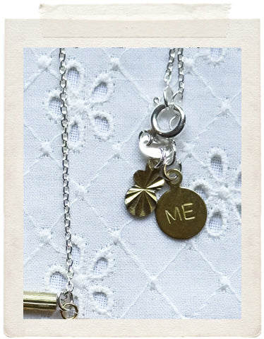 PENDANTS: Miniature: small brass medallion (glazed, sealed, crystal clear and waterproof), vintage fine diamond cut charms in shiny brass and a stamped ME charm on the back of the necklace, so you look adorable from all sides!