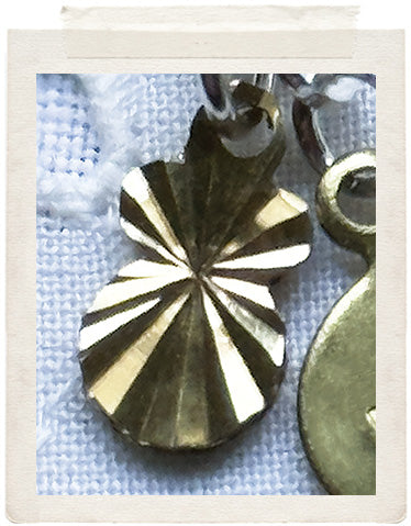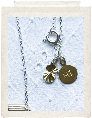 PENDANTS: Miniature: small brass medallion (glazed, sealed, crystal clear and waterproof), vintage fine diamond cut charms in shiny brass and a stamped "Hi" charm on the back of the necklace, so you look adorable from all sides!