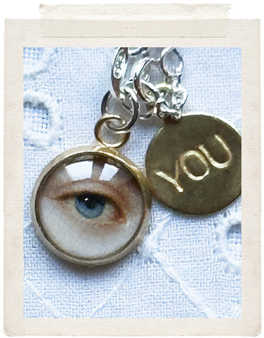 PENDANTS: Miniature: small brass medallion (glazed, sealed, crystal clear and waterproof), vintage fine diamond cut charms in shiny brass, a tiny eye and a stamped YOU charm on the back of the necklace, so you look adorable from all sides!