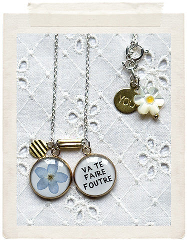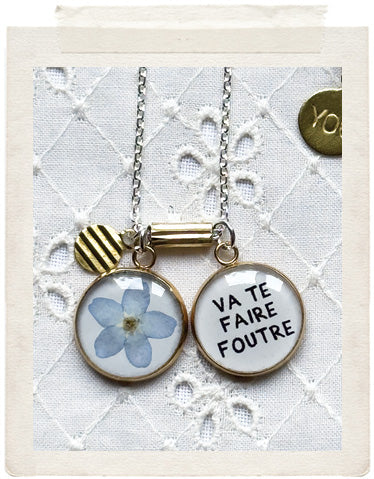 You know how curse words are usually the first things you will learn when you are learning a new language? Why not start with this one which means "GO FUCK YOURSELVES" in French. Wear this perfectly innocent lookin’ necklace around people you hate (probably at work) for absolute self-satisfaction. They probably gush all over that sweet little forget-me-not flower.....hihi. This dainty sterling silver necklace is made in Paris, just for you.♥