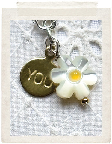 PENDANTS: Miniature: small brass medallion (glazed, sealed, crystal clear and waterproof) and one with a real pressed forget-me-not flower, vintage fine diamond cut charms in shiny brass, a tiny carved mother of pearl daisy and a stamped YOU charm on the back of the necklace, so you look adorable from all sides!