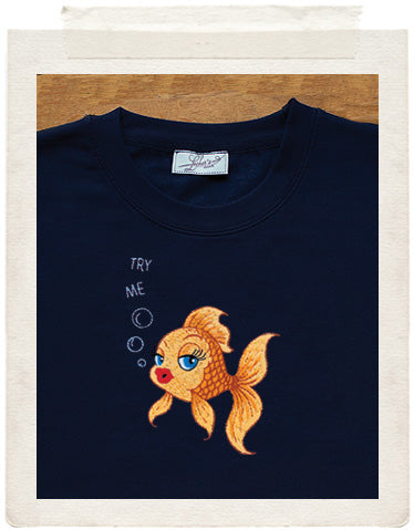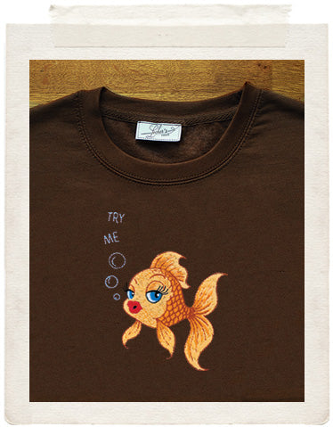 “TRY ME” says the goldfish that’s 5cm of pure audacity. Perfect for when you wanna look adorable but secretly hope someone fucks around and finds out. Wear this sweater when you’re feeling cute but ready to start a fight with someone that deserved it....